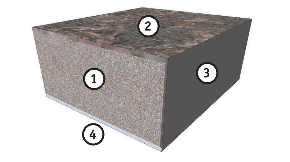 По бокам плиты (3) окантовываются синтетической лентой PVC, дающей возможность отвода статического электричества. По желанию, данное покрытие может отсутствовать.